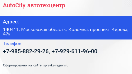 AutoCity, автотехцентр по адресу 140411, Московская область, Коломна, проспект Кирова, 47а в дальнейшем Организация, размещена в следующих категориях: