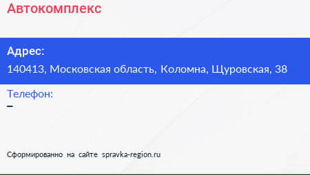 Автокомплекс по адресу 140413, Московская область, Коломна, Щуровская, 38 в дальнейшем Организация, размещена в следующих категориях: