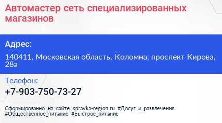 Автомастер, сеть специализированных магазинов по адресу 140411, Московская область, Коломна, проспект Кирова, 28а в дальнейшем Организация, размещена в следующих категориях: