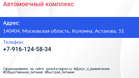 Автомоечный комплекс по адресу 140404, Московская область, Коломна, Астахова, 51 в дальнейшем Организация, размещена в следующих категориях:
