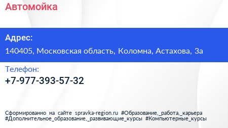 Автомойка по адресу 140405, Московская область, Коломна, Астахова, 3а в дальнейшем Организация, размещена в следующих категориях: