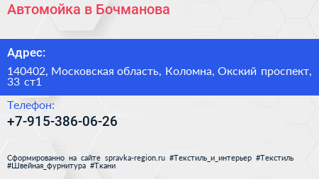 Автомойка в Бочманова по адресу 140402, Московская область, Коломна, Окский проспект, 33 ст1 в дальнейшем Организация, размещена в следующих категориях: