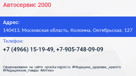 Автосервис 2000 по адресу 140413, Московская область, Коломна, Октябрьская, 127 в дальнейшем Организация, размещена в следующих категориях:
