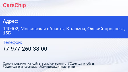 CarsChip по адресу 140402, Московская область, Коломна, Окский проспект, 15Б в дальнейшем Организация, размещена в следующих категориях: