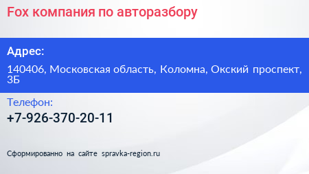 Fox, компания по авторазбору по адресу 140406, Московская область, Коломна, Окский проспект, 3Б в дальнейшем Организация, размещена в следующих категориях: