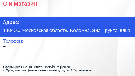 G & N, магазин по адресу 140400, Московская область, Коломна, Яна Грунта, вл8а в дальнейшем Организация, размещена в следующих категориях: