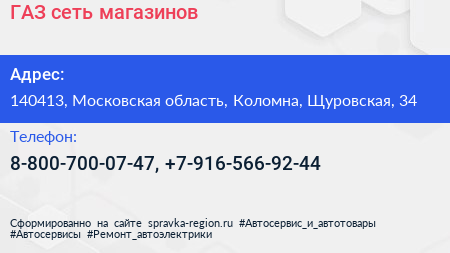 ГАЗ, сеть магазинов по адресу 140413, Московская область, Коломна, Щуровская, 34 в дальнейшем Организация, размещена в следующих категориях: