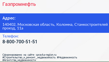 Газпромнефть по адресу 140402, Московская область, Коломна, Станкостроителей проезд, 11а в дальнейшем Организация, размещена в следующих категориях: