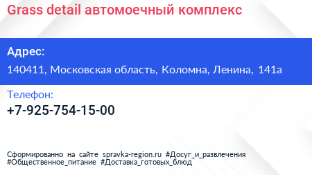 Grass-detail, автомоечный комплекс по адресу 140411, Московская область, Коломна, Ленина, 141а в дальнейшем Организация, размещена в следующих категориях: