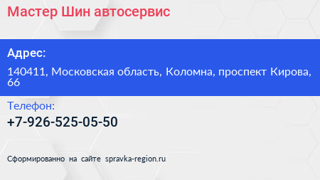 Мастер Шин, автосервис по адресу 140411, Московская область, Коломна, проспект Кирова, 66 в дальнейшем Организация, размещена в следующих категориях: