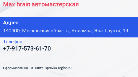 Max-brain, автомастерская по адресу 140400, Московская область, Коломна, Яна Грунта, 14 в дальнейшем Организация, размещена в следующих категориях: