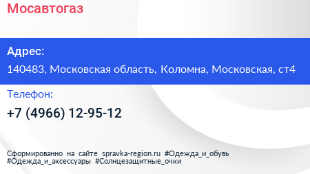 Мосавтогаз по адресу 140483, Московская область, Коломна, Московская, ст4 в дальнейшем Организация, размещена в следующих категориях: