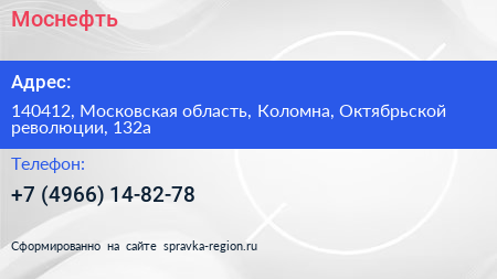 Моснефть по адресу 140412, Московская область, Коломна, Октябрьской революции, 132а в дальнейшем Организация, размещена в следующих категориях: