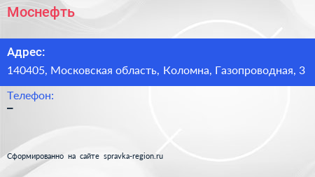 Моснефть по адресу 140405, Московская область, Коломна, Газопроводная, 3 в дальнейшем Организация, размещена в следующих категориях: