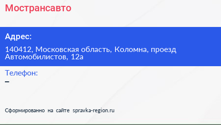 Мострансавто по адресу 140412, Московская область, Коломна, проезд Автомобилистов, 12а в дальнейшем Организация, размещена в следующих категориях: