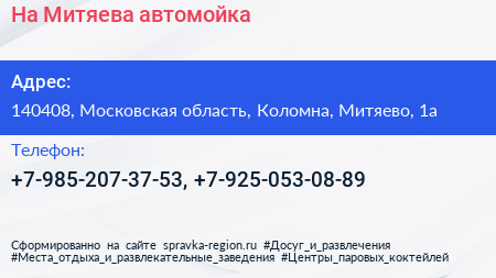 На Митяева, автомойка по адресу 140408, Московская область, Коломна, Митяево, 1а в дальнейшем Организация, размещена в следующих категориях: