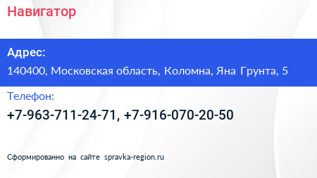 Навигатор по адресу 140400, Московская область, Коломна, Яна Грунта, 5 в дальнейшем Организация, размещена в следующих категориях: