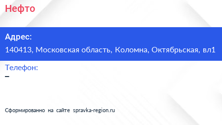 Нефто по адресу 140413, Московская область, Коломна, Октябрьская, вл1 в дальнейшем Организация, размещена в следующих категориях: