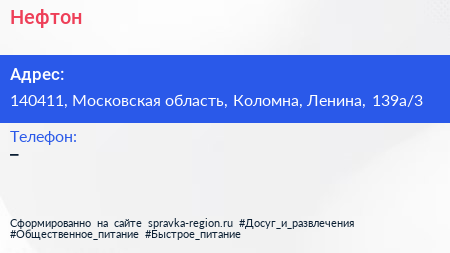 Нефтон по адресу 140411, Московская область, Коломна, Ленина, 139а/3 в дальнейшем Организация, размещена в следующих категориях: