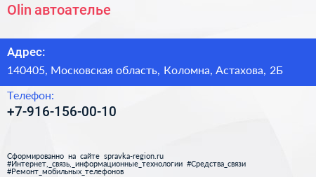 Olin, автоателье по адресу 140405, Московская область, Коломна, Астахова, 2Б в дальнейшем Организация, размещена в следующих категориях: