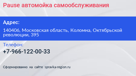 Pause, автомойка самообслуживания по адресу 140406, Московская область, Коломна, Октябрьской революции, 395 в дальнейшем Организация, размещена в следующих категориях: