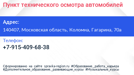 Пункт технического осмотра автомобилей по адресу 140407, Московская область, Коломна, Гагарина, 70а в дальнейшем Организация, размещена в следующих категориях: