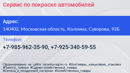 Сервис по покраске автомобилей по адресу 140402, Московская область, Коломна, Суворова, 92Б в дальнейшем Организация, размещена в следующих категориях: