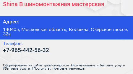 Shina-B, шиномонтажная мастерская по адресу 140405, Московская область, Коломна, Озёрское шоссе, 32а в дальнейшем Организация, размещена в следующих категориях: