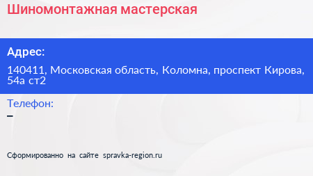 Шиномонтажная мастерская по адресу 140411, Московская область, Коломна, проспект Кирова, 54а ст2 в дальнейшем Организация, размещена в следующих категориях: