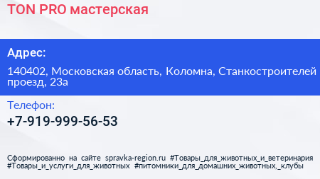 TON PRO, мастерская по адресу 140402, Московская область, Коломна, Станкостроителей проезд, 23а в дальнейшем Организация, размещена в следующих категориях: