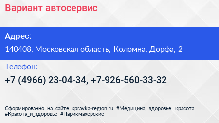 Вариант, автосервис по адресу 140408, Московская область, Коломна, Дорфа, 2 в дальнейшем Организация, размещена в следующих категориях:
