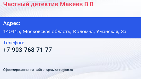Частный детектив Макеев В.В. по адресу 140415, Московская область, Коломна, Уманская, 3а в дальнейшем Организация, размещена в следующих категориях: