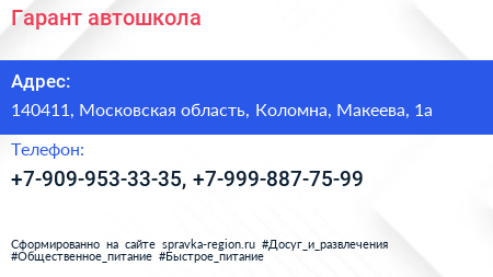 Гарант, автошкола по адресу 140411, Московская область, Коломна, Макеева, 1а в дальнейшем Организация, размещена в следующих категориях: