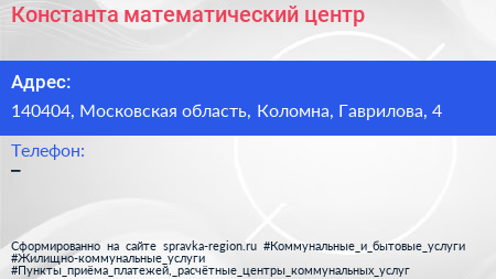 Константа, математический центр по адресу 140404, Московская область, Коломна, Гаврилова, 4 в дальнейшем Организация, размещена в следующих категориях: