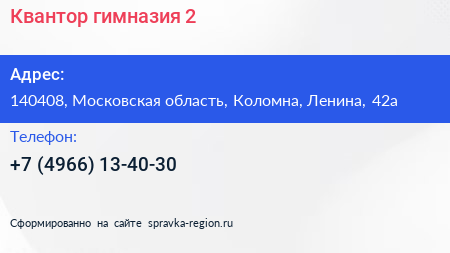 Квантор, гимназия №2 по адресу 140408, Московская область, Коломна, Ленина, 42а в дальнейшем Организация, размещена в следующих категориях: