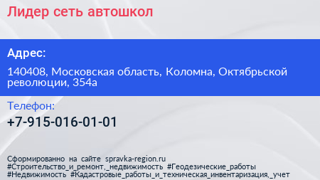 Лидер, сеть автошкол по адресу 140408, Московская область, Коломна, Октябрьской революции, 354а в дальнейшем Организация, размещена в следующих категориях: