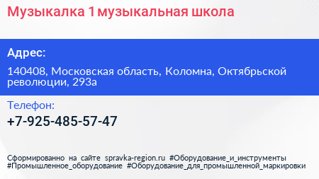 Музыкалка №1, музыкальная школа по адресу 140408, Московская область, Коломна, Октябрьской революции, 293а в дальнейшем Организация, размещена в следующих категориях: