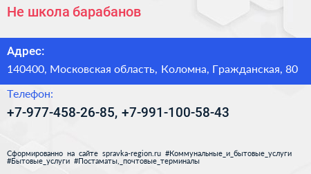 Не школа барабанов по адресу 140400, Московская область, Коломна, Гражданская, 80 в дальнейшем Организация, размещена в следующих категориях: