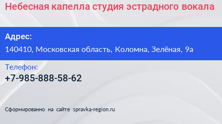 Небесная капелла, студия эстрадного вокала по адресу 140410, Московская область, Коломна, Зелёная, 9а в дальнейшем Организация, размещена в следующих категориях: