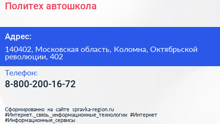 Политех, автошкола по адресу 140402, Московская область, Коломна, Октябрьской революции, 402 в дальнейшем Организация, размещена в следующих категориях: