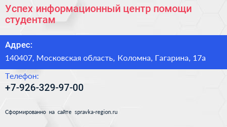 Успех, информационный центр помощи студентам по адресу 140407, Московская область, Коломна, Гагарина, 17а в дальнейшем Организация, размещена в следующих категориях: