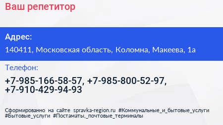 Ваш репетитор по адресу 140411, Московская область, Коломна, Макеева, 1а в дальнейшем Организация, размещена в следующих категориях: