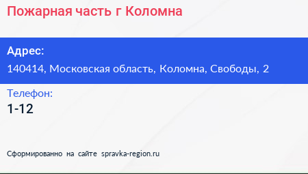 Пожарная часть, г. Коломна по адресу 140414, Московская область, Коломна, Свободы, 2 в дальнейшем Организация, размещена в следующих категориях: