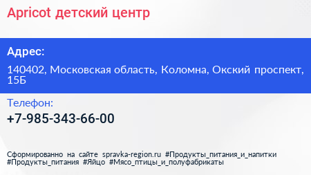 Apricot, детский центр по адресу 140402, Московская область, Коломна, Окский проспект, 15Б в дальнейшем Организация, размещена в следующих категориях: