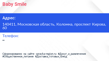 Baby Smile по адресу 140411, Московская область, Коломна, проспект Кирова, 60 в дальнейшем Организация, размещена в следующих категориях: