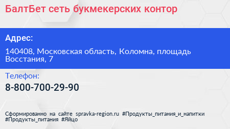 БалтБет, сеть букмекерских контор по адресу 140408, Московская область, Коломна, площадь Восстания, 7 в дальнейшем Организация, размещена в следующих категориях: