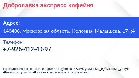 Добролавка, экспресс-кофейня по адресу 140408, Московская область, Коломна, Малышева, 17 к4 в дальнейшем Организация, размещена в следующих категориях: