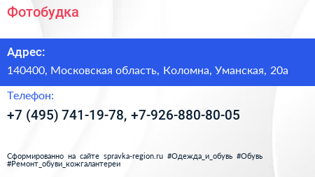 Фотобудка по адресу 140400, Московская область, Коломна, Уманская, 20а в дальнейшем Организация, размещена в следующих категориях: