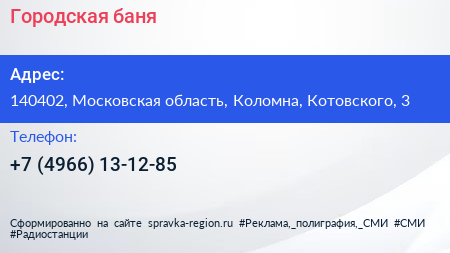 Городская баня по адресу 140402, Московская область, Коломна, Котовского, 3 в дальнейшем Организация, размещена в следующих категориях: