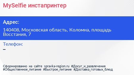 MySelfie, инстапринтер по адресу 140408, Московская область, Коломна, площадь Восстания, 7 в дальнейшем Организация, размещена в следующих категориях: